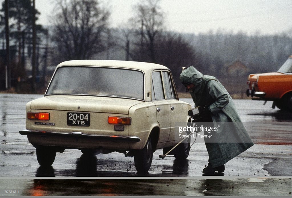 12. Сентябрь 1986-го, дозиметристы проверяют автомобили, возвращающиеся в город со стороны Чернобыльской АЭС — в то время уже существовала Тридцатикилометровая Зона отчуждения и шло активное строительство Саркофага над Четвертым блоком ЧАЭС — он был достроен к ноябрю 1986-го.