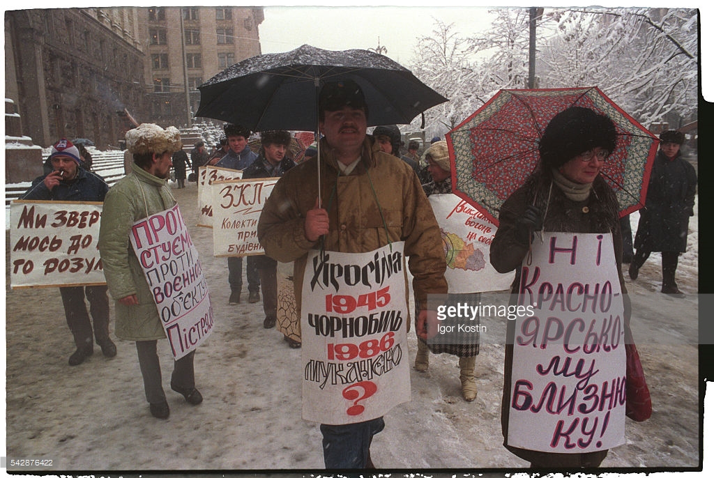 19. А это — киевские протестующие, снимок тоже сделан в 1990 году на Крещатике. На плакатах надписи против Чернобыля и против каких-то военных объектов.
