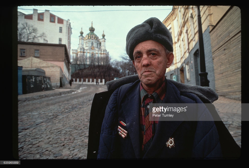 20. 1991 год, ветеран со знаками ранений, фото сделано в районе Андреевского спуска, на заднем плане — Андреевская церковь.