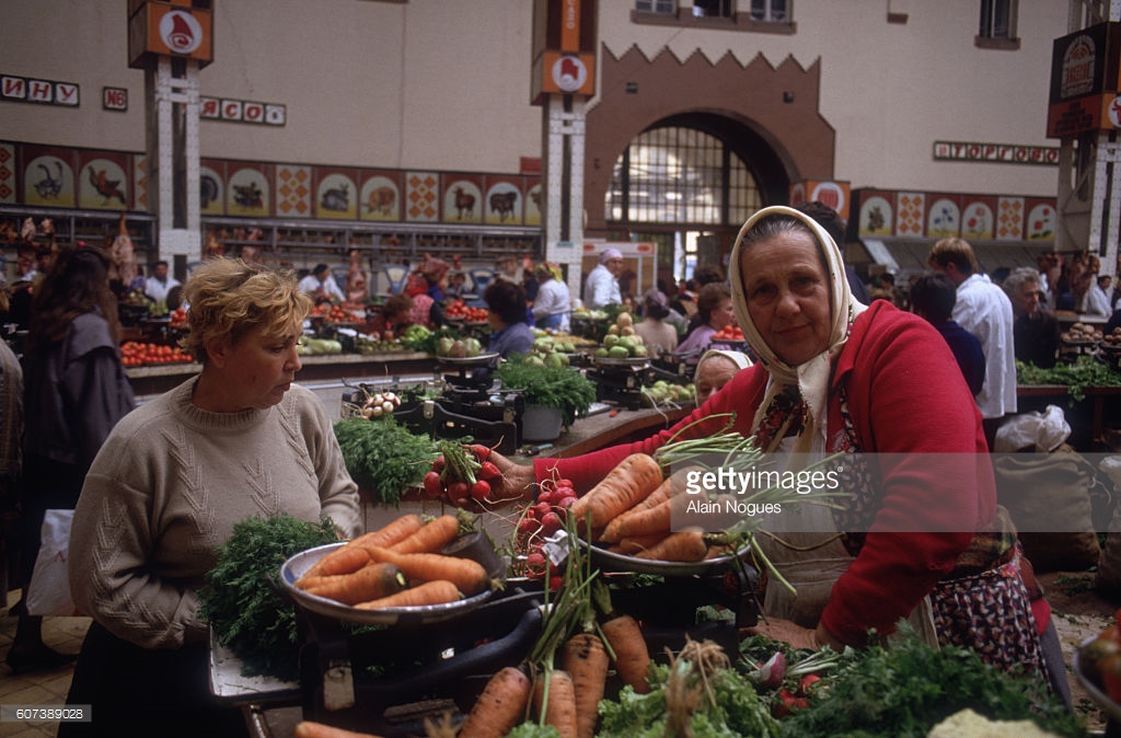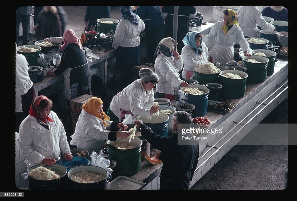 21. Рынок, 1991 год. На прилавках — практически исключительно баки с квашеной капустой, которую торговки дают попробовать покупателям.