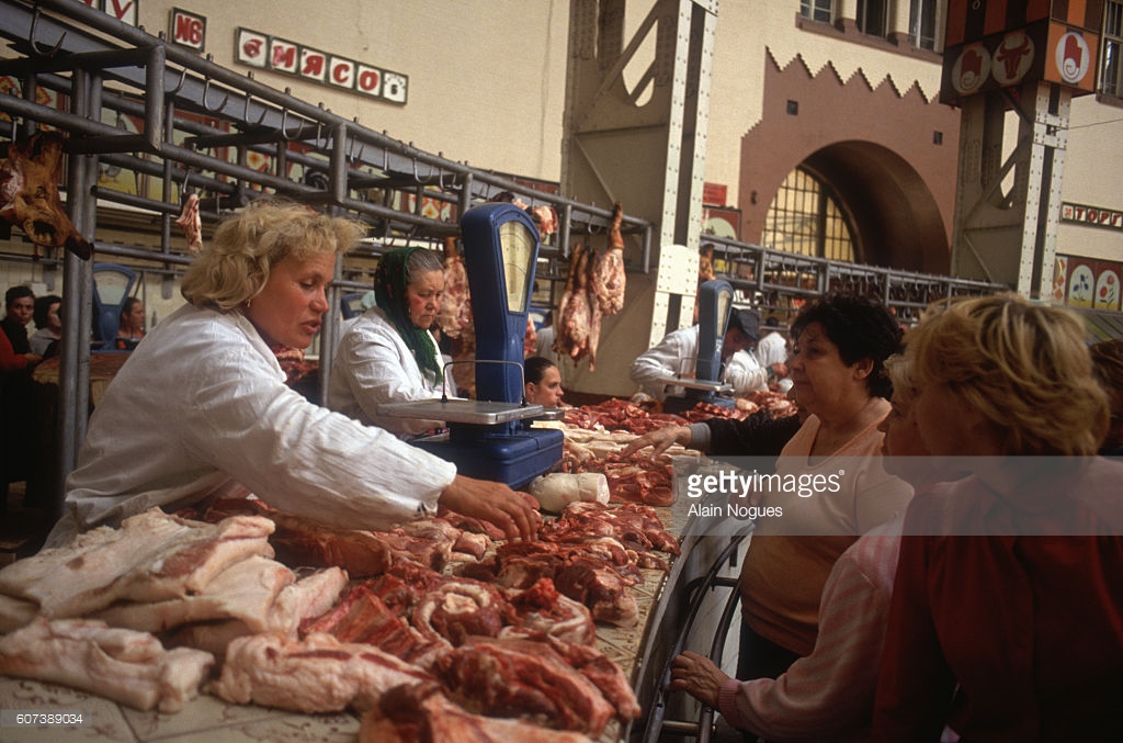 22. Тоже Бессарабский рынок, мясной отдел. Продают, скорее всего, мясо с частных подворий — в то время его можно было купить на рынках, тогда как в магазинах были пустые полки.
