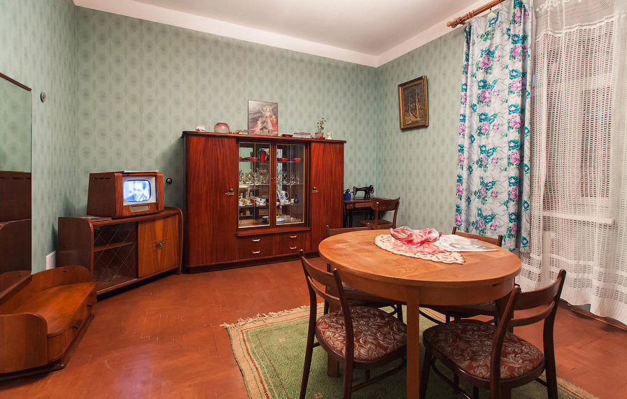 На стенах квартиры обязательно должны были быть дорогие (лучше несоветские) обои с полосочками и рисунком, на полу и стенах — ковры, а в сервантах и на стенах — предметы коллекционирования. Нормального рынка антиквариата в СССР не было, поэтому советские богачи собирали всякий хлам, который стал эрзацем антиквариата и считался «ценным» — скупался втридорога всякий хрусталь «богемия», по пятикратной цене покупались страшные люстры с висюльками, а по объявлениям в газетах разыскивались всякие старые ржавые буденновские сабли и сувенирные грузинские кинжалы — которые должны были изображать на ковре коллекцию оружия.