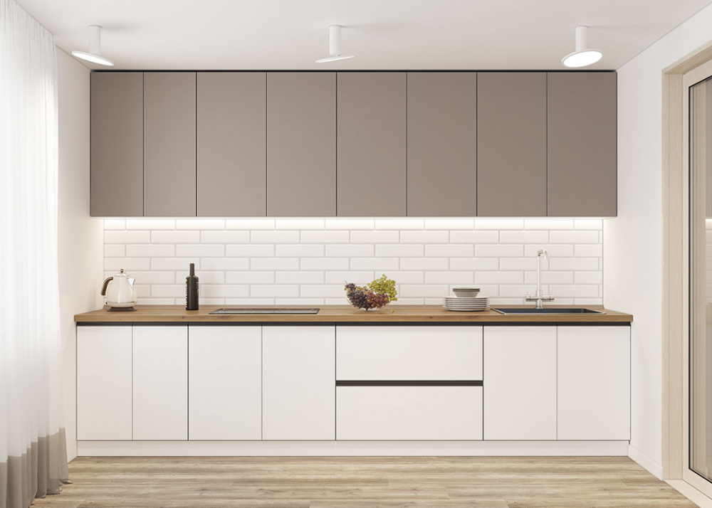 Как правило, все мебельные комплекты состоят из каркаса, фасада, столешницы и фурнитуры, а вот планировка бывает очень разнообразной. Прямые гарнитуры рекомендуют при нехватке свободного пространства, в частности в квартирах стандартной планировки.