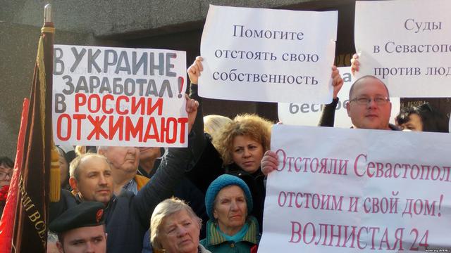 В руках митингующие держали плакаты с лозунгами «В Украине заработал! В России отжимают», «Судьи и чиновники с материка! Возвращайтесь по своим родным местам, хватит издеваться над севастопольским народом! Мы вас не звали! Хватит оккупации!»
