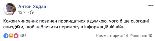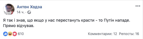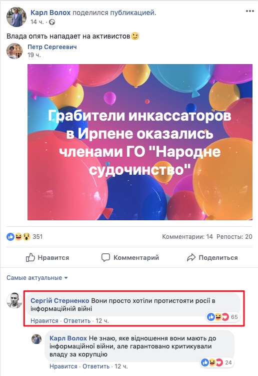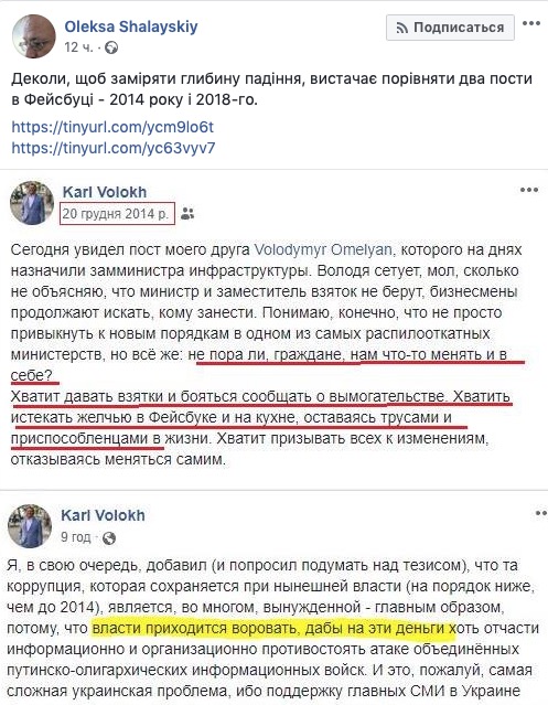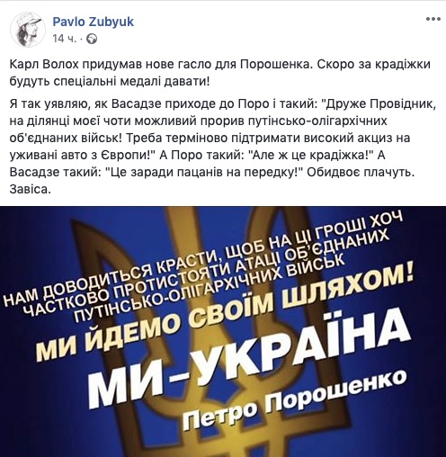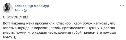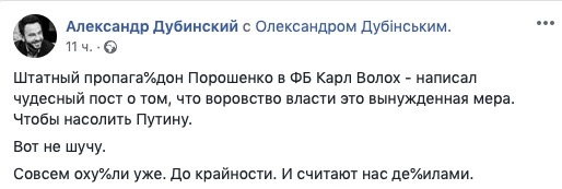 Украинские власти воруют меньше, чем до 2014 года, и вынуждены это делать, чтобы противостоять атаке путинско-олигархических информационных войск. Об этом на своей странице в Facebook заявил блогер и активист Карл Волох.