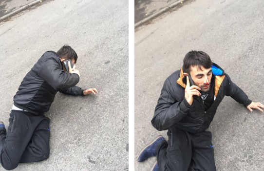 «Еду утром по Госпитальному переулку в сторону военного госпиталя. Поравнявшись с пешеходом на тротуаре, эта падла решила броситься мне под колёса. Удар, шок, все дела. Выхожу, вижу — смотрит на меня с положения лёжа. Как увидел меня рядом, начался цирк: конвульсии, кровь на асфальте (видать опыта мало, разбил шнобель себе). Подошли свидетели, сказали успокоиться, они всё видели. Тут я начал немного приходить в себя, проверил регик (слава Богу работал) подошло еще три свидетеля, дали номера телефонов, один сказал, что у него тоже есть запись сего действа», — написал он.