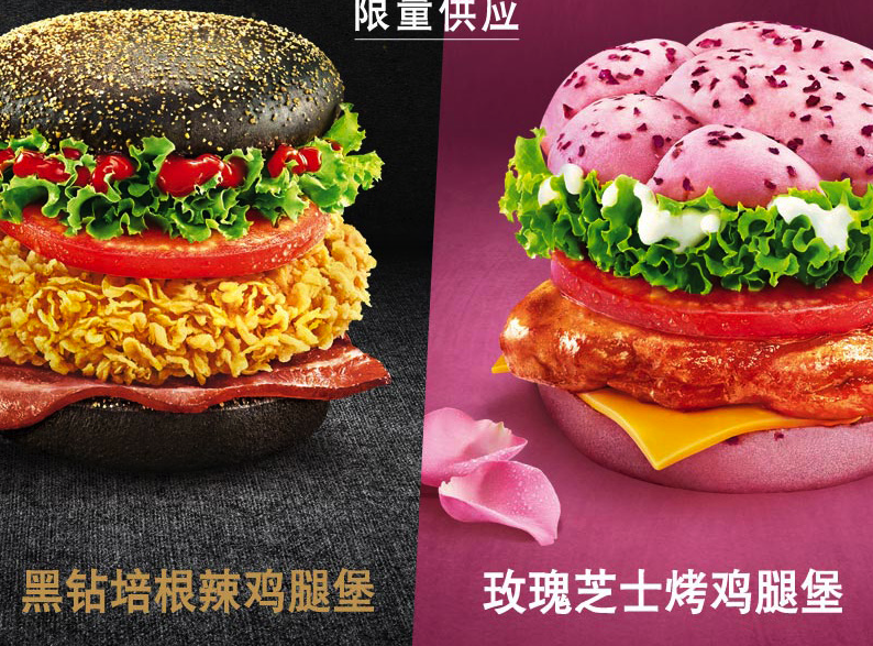 Сеть ресторанов быстрого питания KFC предложила своим китайским клиентам розовые бургеры с курицей. Как сообщает UPI, в меню также появился черный бургер с курицей и беконом.
