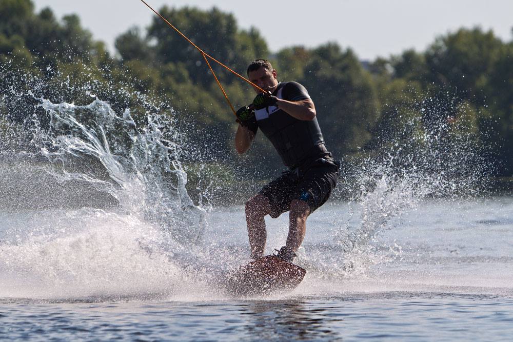 Мэр Киева Виталий Кличко сегодняшний день провел активно- проехал на велосипеде 24 км и занялся вейкбордингом на Днепре.