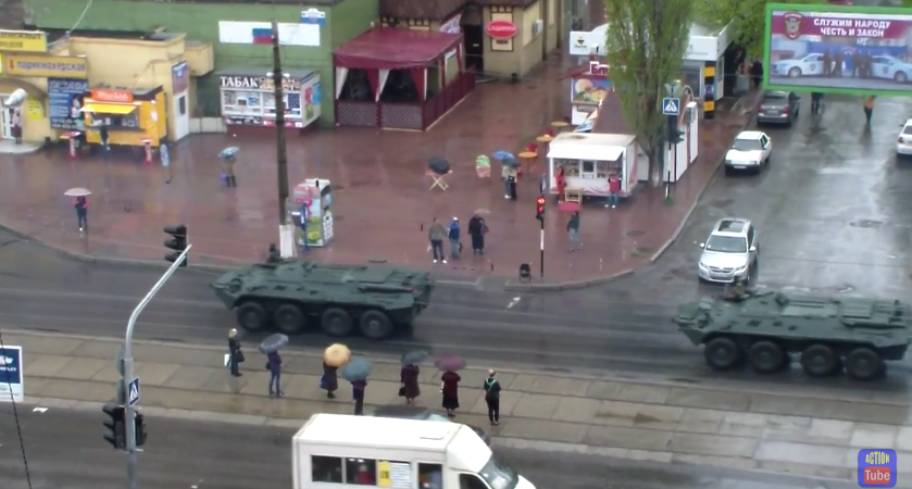 Колонна российской военной техники прошла по Луганску. Видео опубликовано 1 мая на видеохостинге YouTube.