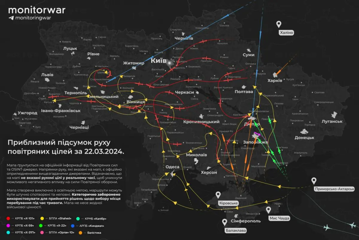 - Ночью и утром 22 марта российские террористы нанесли комбинированный ракетно-авиационный удар по Украине. Враг применил 151 средство воздушного нападения.