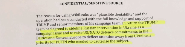 «В обмен команда Трампа согласилась отстраниться от российского вторжения в Украину, как части кампании, и заняться оборонительными обязанностями США-НАТО в Балтии и Восточной Европе, чтобы отвлечь внимание от Украины, приоритетной для Путина, тема которой должна быть вытравлена» — отмечается в «компромате».