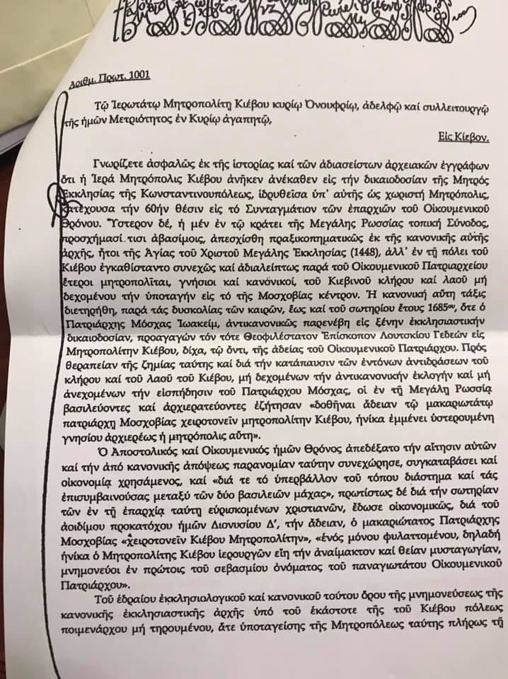 «Мы сообщаем Вам, что после выборов предстоятеля украинской церкви органом, который будет состоять из клириков и мирян, Вы не сможете еклизиологически и канонически носить титул митрополита Киевского, который Вы все равно носите сейчас в нарушение условий официальных документов 1686 года», — сказано в документе.