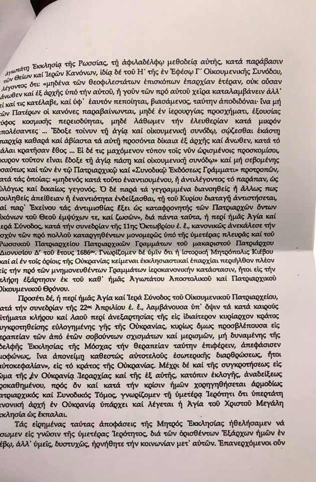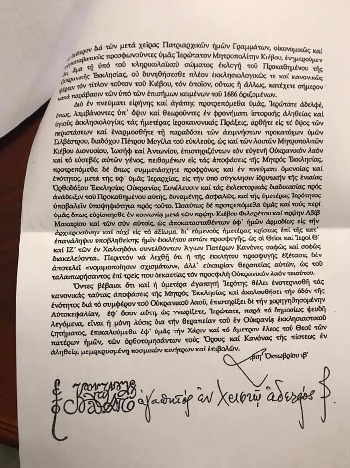 «Будучи уверенным, что Ваше Высокопреосвященство также примет эти канонические решения Матери-Церкви и будет следовать пути единства во благо украинского народа и поддержит автокефалию, которая будет предоставлена. Поскольку, как Ваше Высокопреосвященство знает, несмотря на то, что неправильно произносится публично, она является единственным решением для излечения церковной проблемы Украины. Мы призываем на Вас Благодать и неизмеримую милость Бога отцов наших, которые правильно отделили оросы и каноны веры в истине от мирских мотивов и навязываний», — резюмировал Варфоломей.