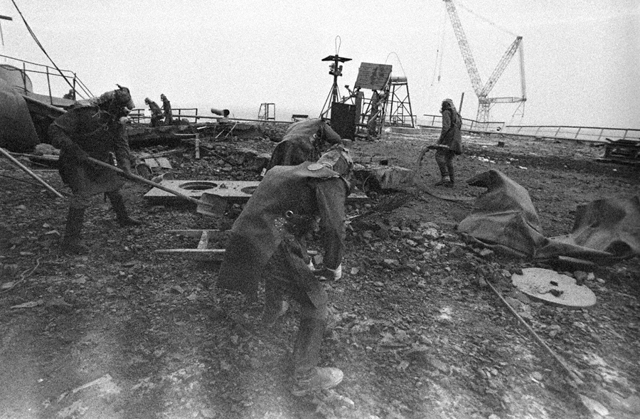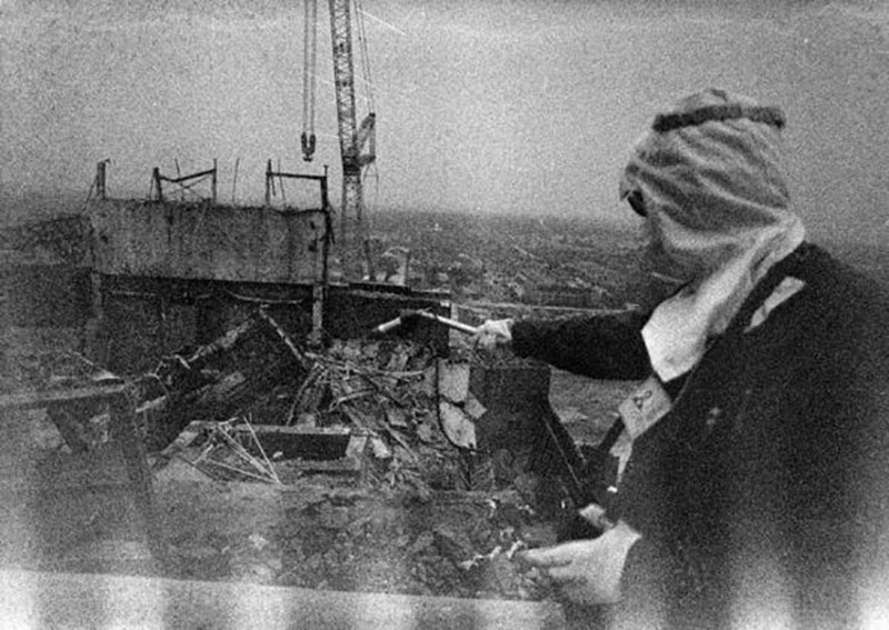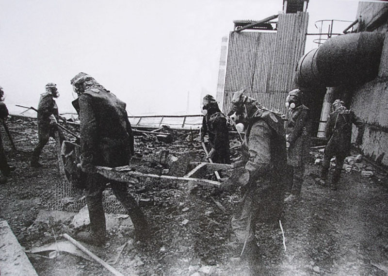Наверное, самыми жуткими работами во время ликвидации последствий аварии в Чернобыле были работы на крышах Третьего энергоблока и машинного зала. По плану ликвидации последствий аварии все фонящие обломки активной зоны реактора (графитовые блоки, трубки тепловыделяющих сборок) должны были быть собраны и сброшены обратно в развал, образовавшийся от взрыва реактора.