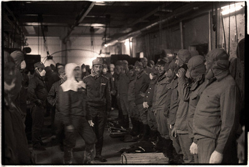 Очередная группа ликвидаторов проходит инструктаж перед выходом на крышу — они уже переодеты в спецодежду, но пока что без свинцовой защиты — интересно, ее надевали каждый раз новую или использовали одну и ту же? Нигде не встречал этой информации.