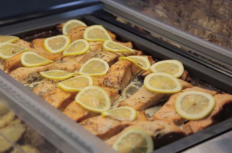 Меню состоит из десятков наименований блюд: суп-пюре из брокколи, чебурек с сыром, лосось на пару, мясной стейк, рис с овощами, печеный картофель, три вида салатов, а еще отдельно ‒ нарезка овощей, соусы, выпечка, в том числе несколько видов сладкого, фрукты, соки, вода, кофе, чай, сливки, мороженое. Каждый день новое меню и требование ‒ два гарнира.
