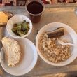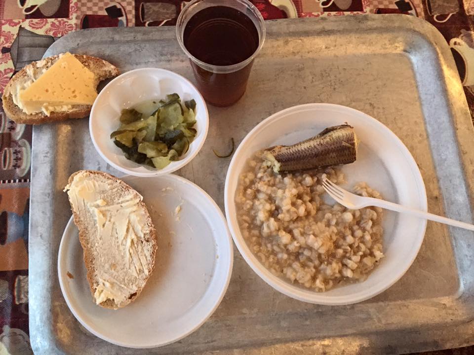 Їдальня — невелика кімната з кількома столами під стіною і трьома обідніми столами. На столах при стінці стоять хліб, одноразові вилки-ложки, одноразові тарілки, кастрюлі з їжею.