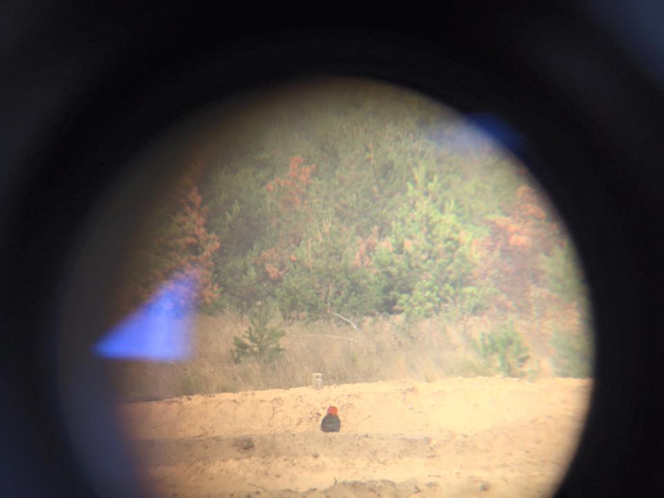 Друга спроба. Другий номер (внший снайпер) мені каже цілитись в нижній правий кут. Цілюсь, а сам намагаюсь якось так примрудити око, щоб ьрова кудись відійшла з лінії ймовірного руху прицілу. Ну і теж не влучив. Другий номер каже, що куля прилетіла нижче.