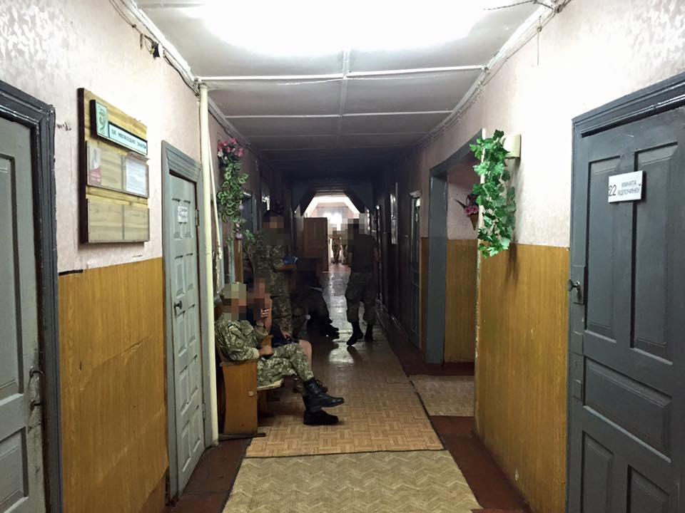 Потім вона кудись йде. Заходить чоловік у військовій формі. Дивиться нам горла і підсвічує собі телефоном. Бере оцей прилад щоб слухати грудну клітку. Каже знімати футболку. Руки — за голову. Лікті звести перед обличчям. Слухає нас по-черзі.