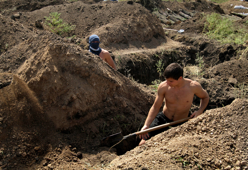 Второй день подряд жители Мариуполя готовятся встретить врага у своих домов. Местные жители роют окопы и строят блокпосты.
