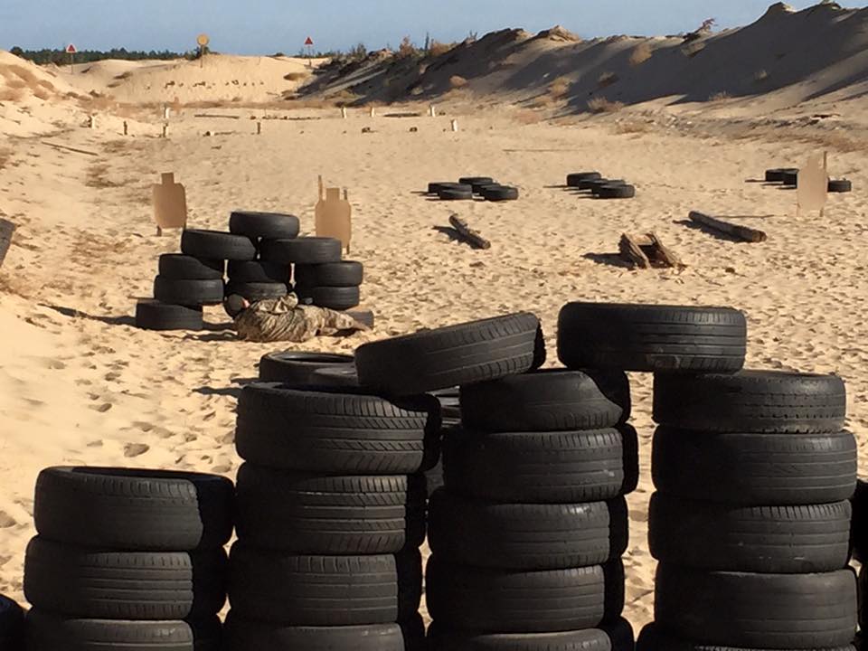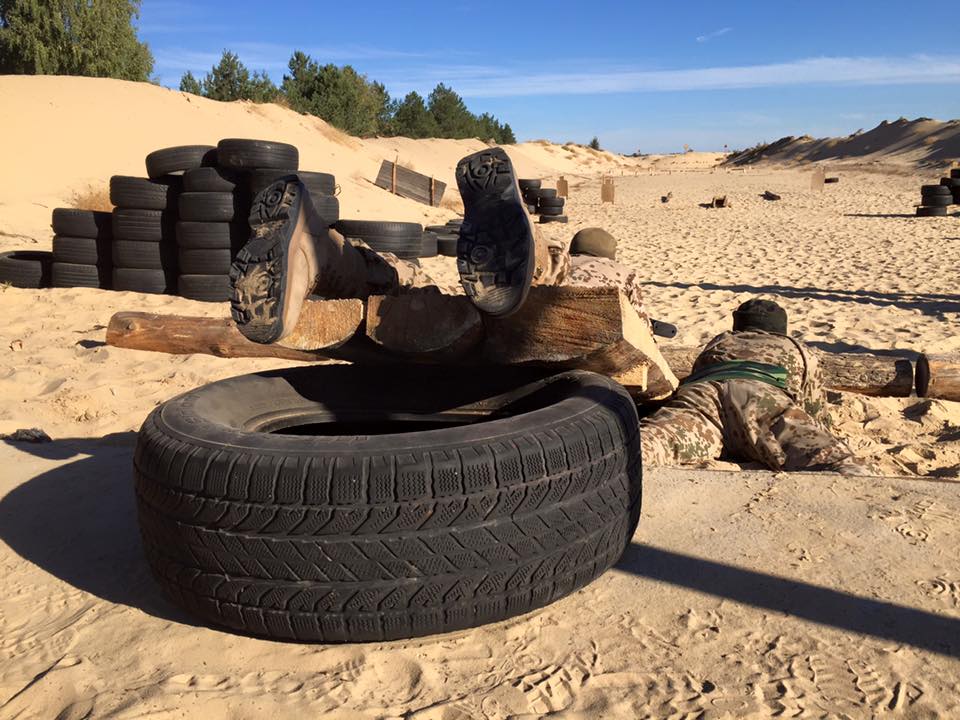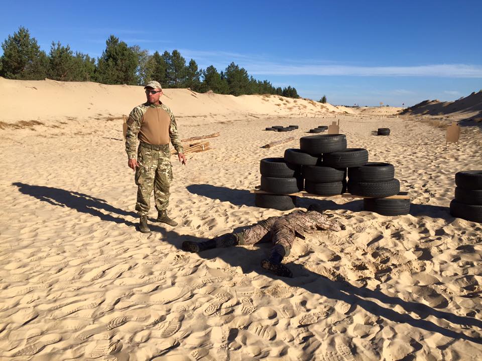 Спочатку Сергій показує, що і як ми маємо зробити. Автоматник і снайпер починають з позиції лежачи. Поряд. Відпрацьовують по цілях. Автоматник каже «чисто» і чекає, поки снайпер (командир групи) не відпрацює свої цілі і не дасть команду рухатись далі. Далі автоматник працює по цілях з «умовних вікон». І так само каже «чисто» і чекає команду снайпера. Потім вони обоє біжать до макета машини, щоб стріляти лежачи з-під машини з незручного лівого боку. Але вже не з АКС чи СВД, а з пістолета.