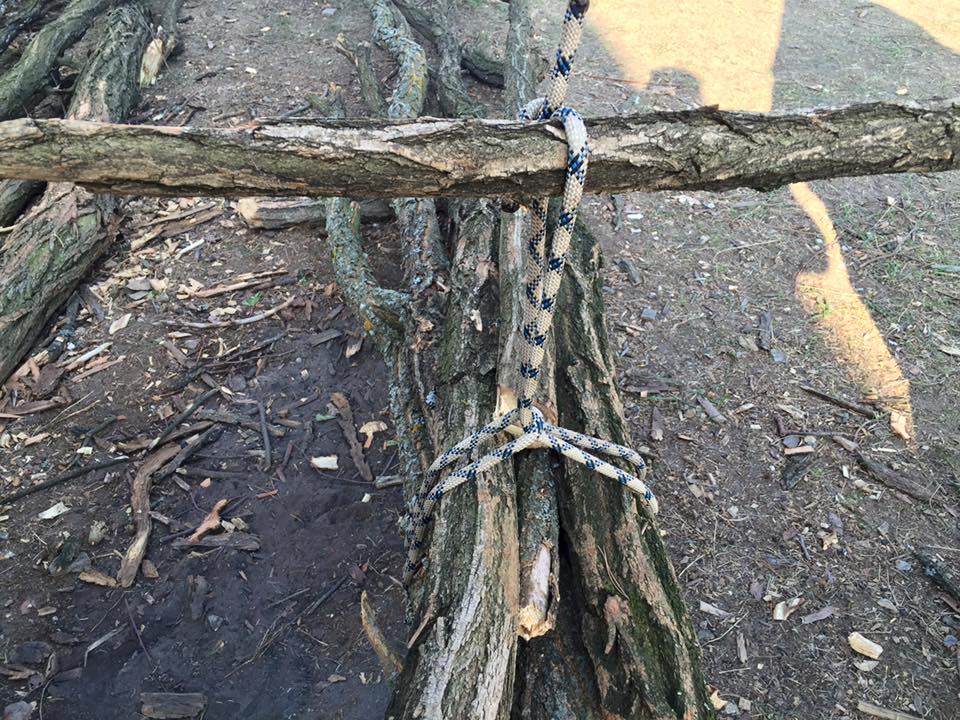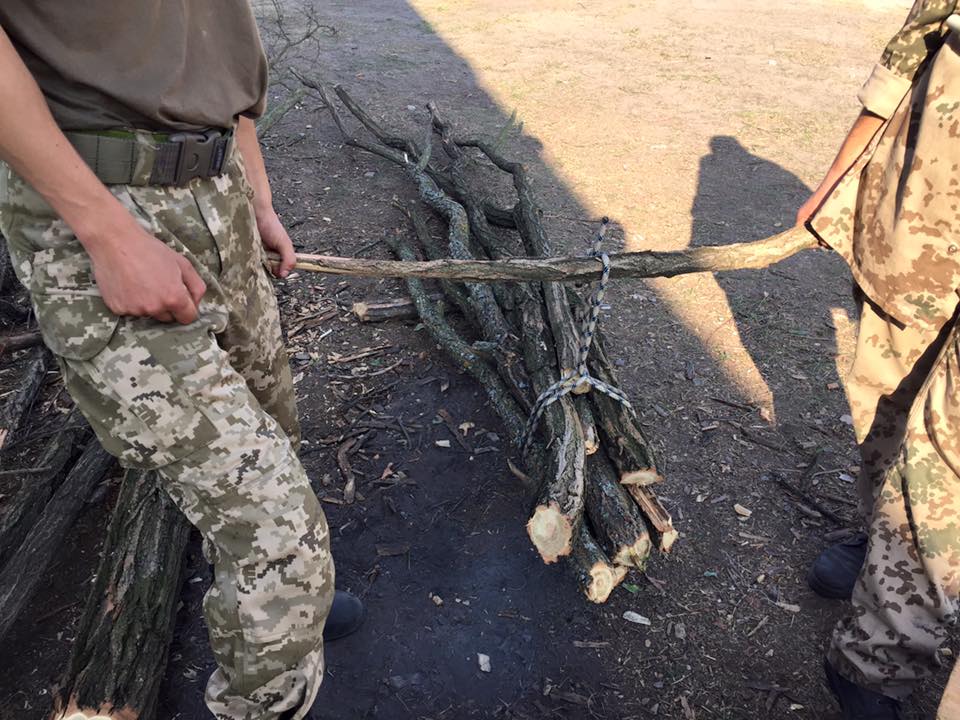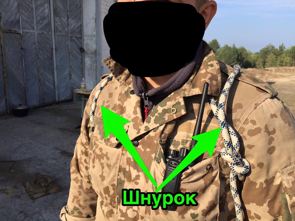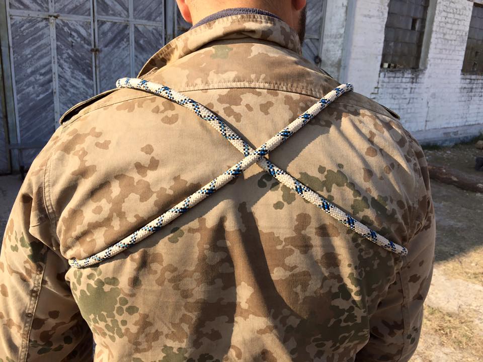У нас у кожного є 2,5 м канату. Такого шнурка 1 см товщиною. Прапорщик сказав постійно носити його з собою, як надзвичайно корисну річ. Його кінці треба зв’язати. Носити його також треба особливим способом. Зробивши вісімку і одягнувши руки у петлі. Перехрестивши шнурок на спині.