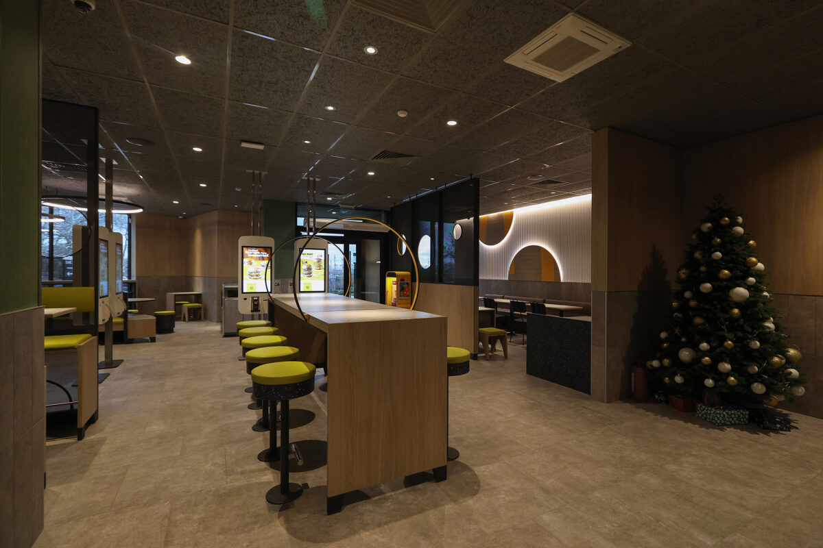 Атмосферный ресторан площадью 444 м 2 размещает 84 гостей в зале и 36 на террасе. В хорошую погоду посетители могут взять ароматный кофе с собой на прогулку по городу, а автомобилистам будет удобно заказать любимые блюда на МакДрайве, обустроенном двумя линиями въезда.