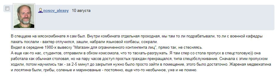 Разумеется, в такую «номенклатурную колбасу» никто не добавлял крахмал, пищевую плазму и прочую «массу говяжью или свиную» — она делалась исключительно из качественного сырья для питания 3-5% граждан, проживающих в исключительно комфортном персональном СССР. Ну а ейчас дети номенклатурных семей рассказывают истории про «качественные советские ГОСТы» и сетуют на то, что их спецпайки куда-то пропали в лихие девяностые…