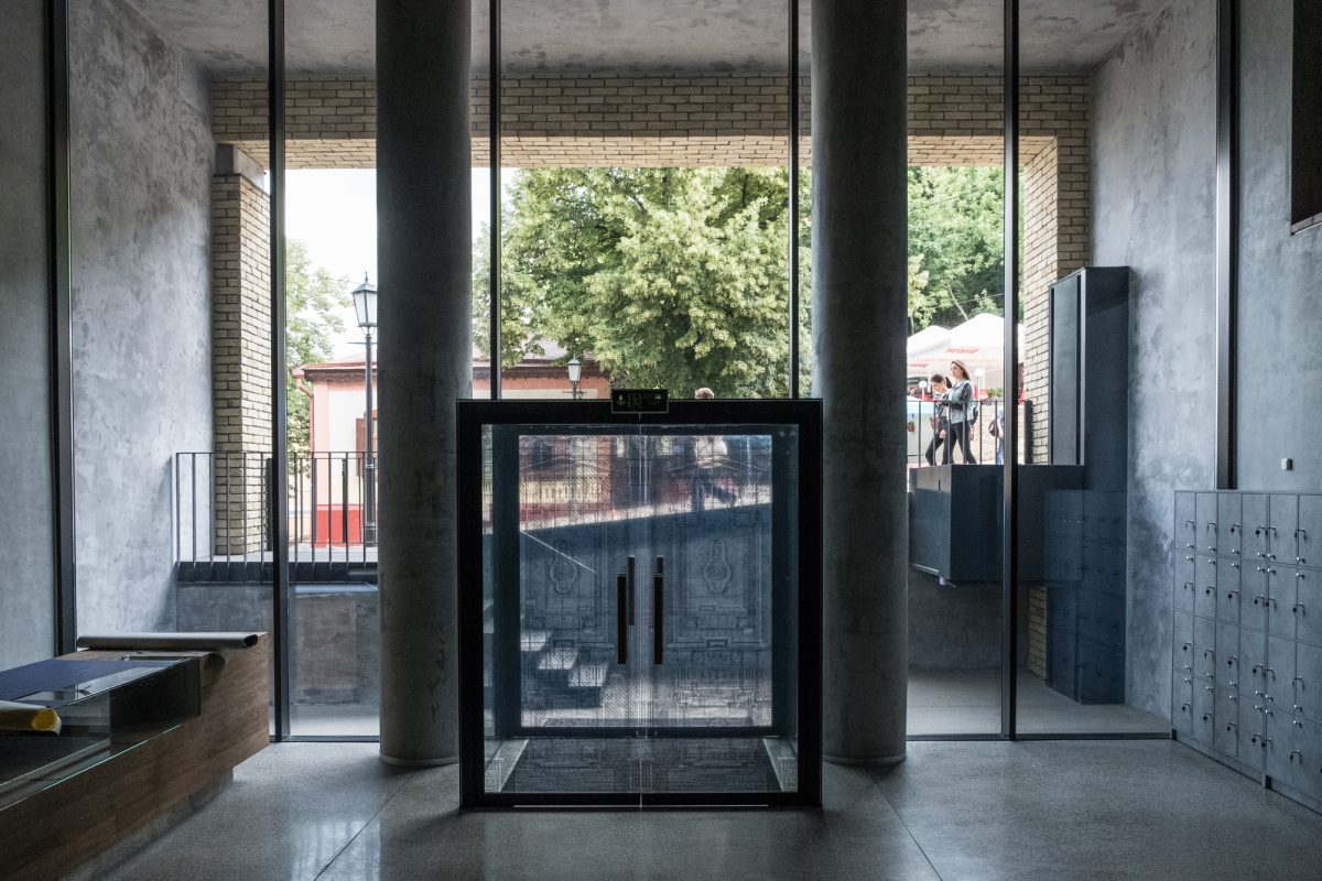 На парадном входе в театр между двумя пластинами стекла — фотоотпечаток первой двери старого здания Театра на Подоле, расположенного рядом.