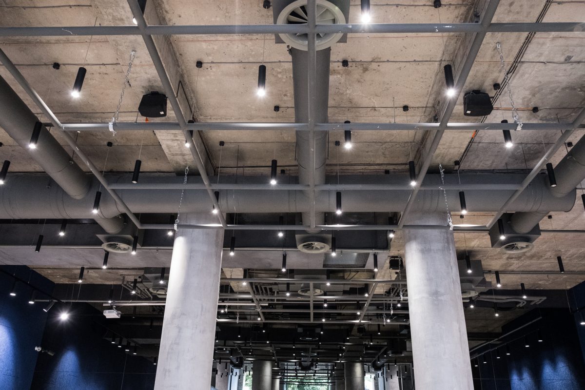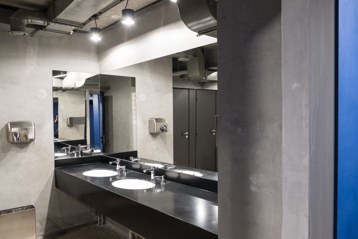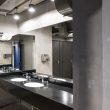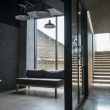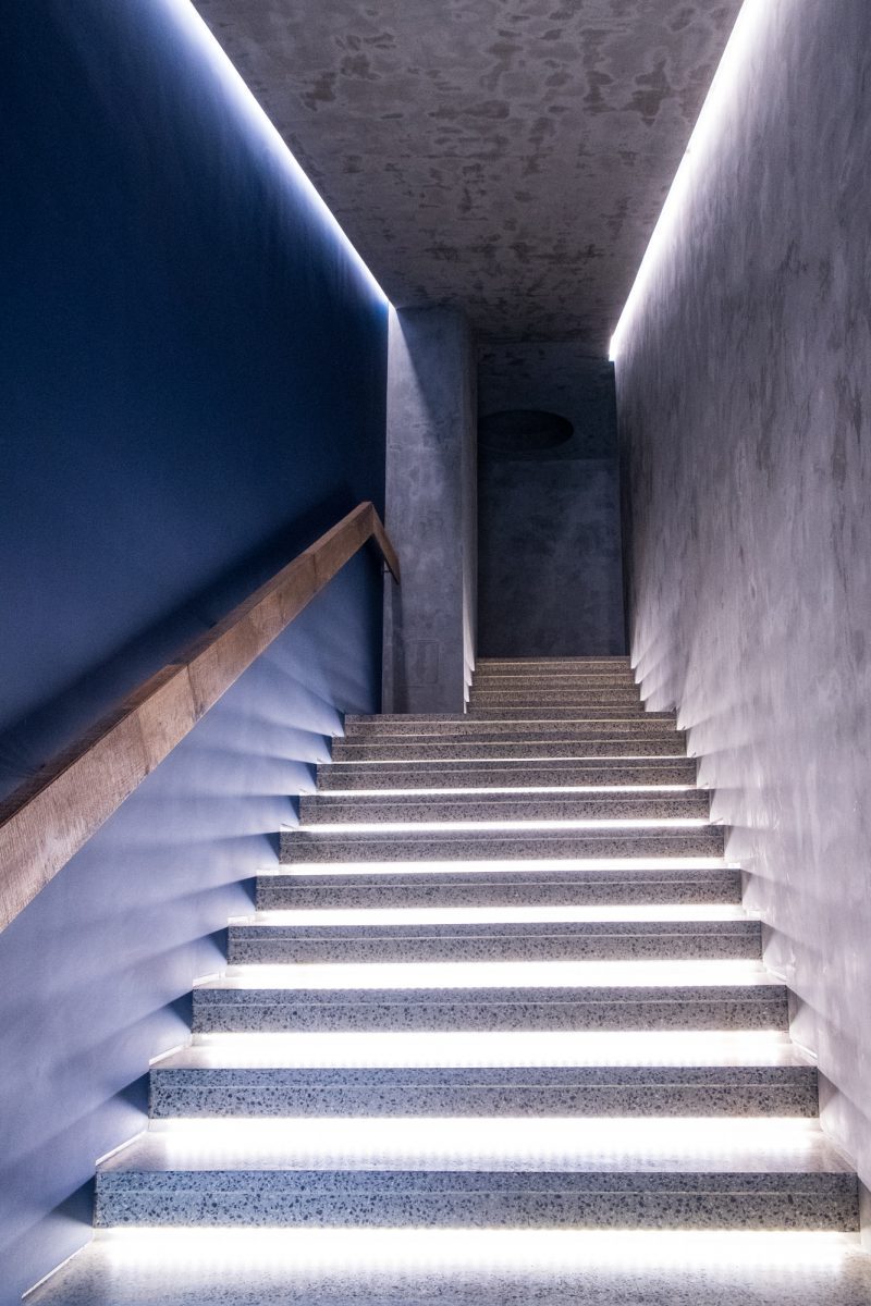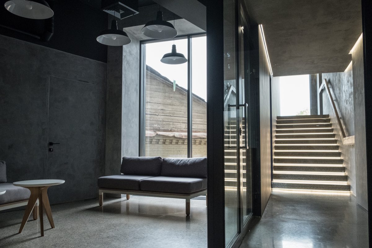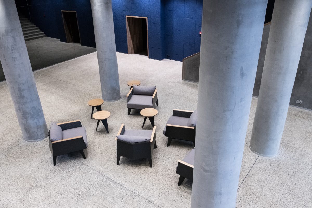 В фойе по центру — массивные бетонные колонны, несколько кресел и небольших столиков. Минималистично и без лишнего пафоса, словно декорация на сцене в ожидании выхода артистов. Зеркальная стена напротив входа создает иллюзию, что места еще больше.