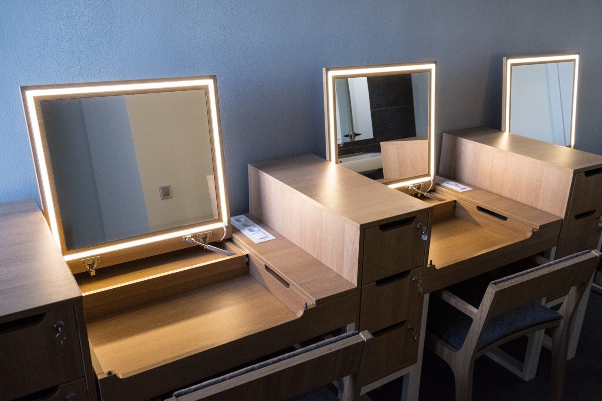 Гримерных в театре пять, почти каждый актер имеет собственный гримерной столик. Оксана говорит, что труппа долго ждала такого счастья, ведь в малом здания есть только женская гримерная на несколько столиков. Актерам-мужчинам приходится ютиться в рабочей зале.
