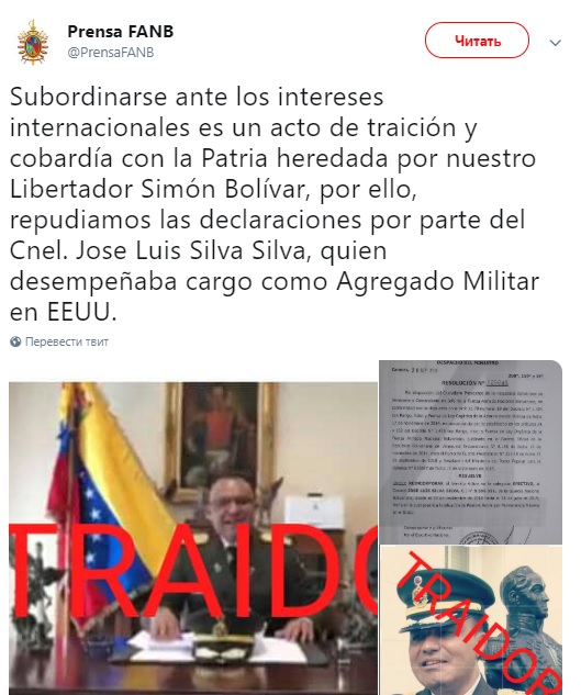 «Это акт измены и трусости по отношению к родине…мы отвергаем заявления полковника Хосе Луиса Сильвы, который занимал должность военного атташе в США», — сказано в сообщении.
