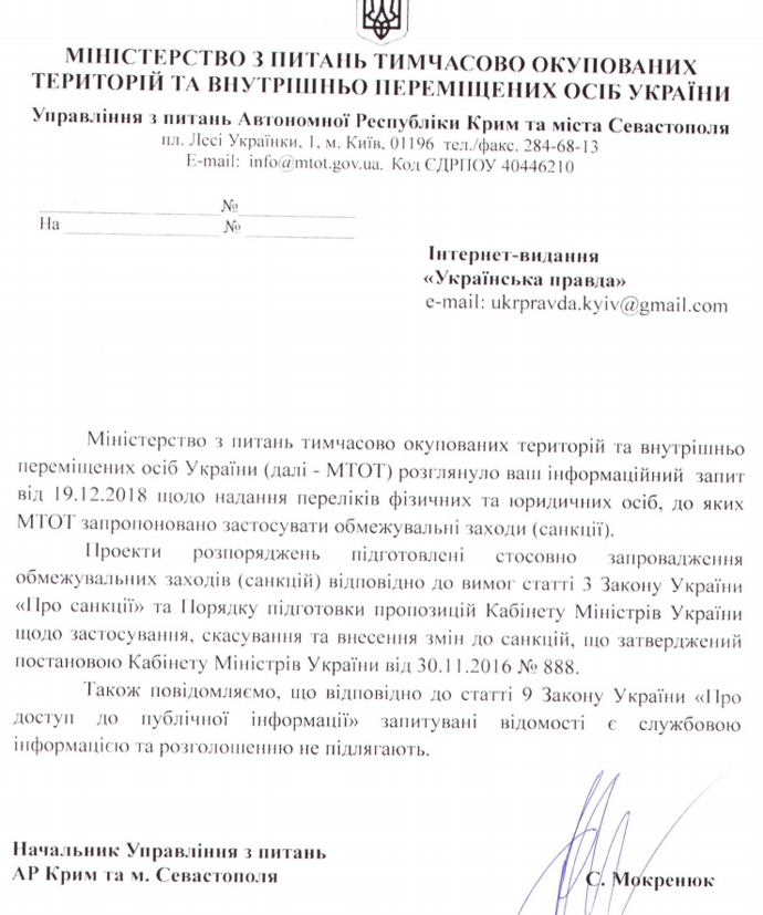 Список юридических и физических лиц, против которых введены новые антироссийские санкции, не подлежит разглашению. Об этом говорится в ответах министерства на соответствующие запросы «Украинской правды«.