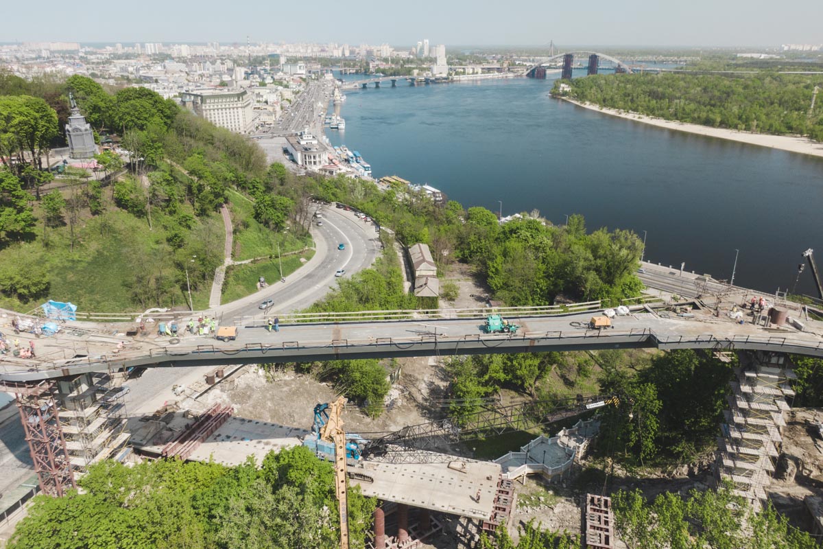 Короткую историю возведения моста показал в опубликованном видео мэр Киева Виталий Кличко. По его словам, самым важным этапом строительства конструкции стало поднятие центральной части моста длиной 63 метра и весом 125 тонн. Ее монтаж занял трое суток.