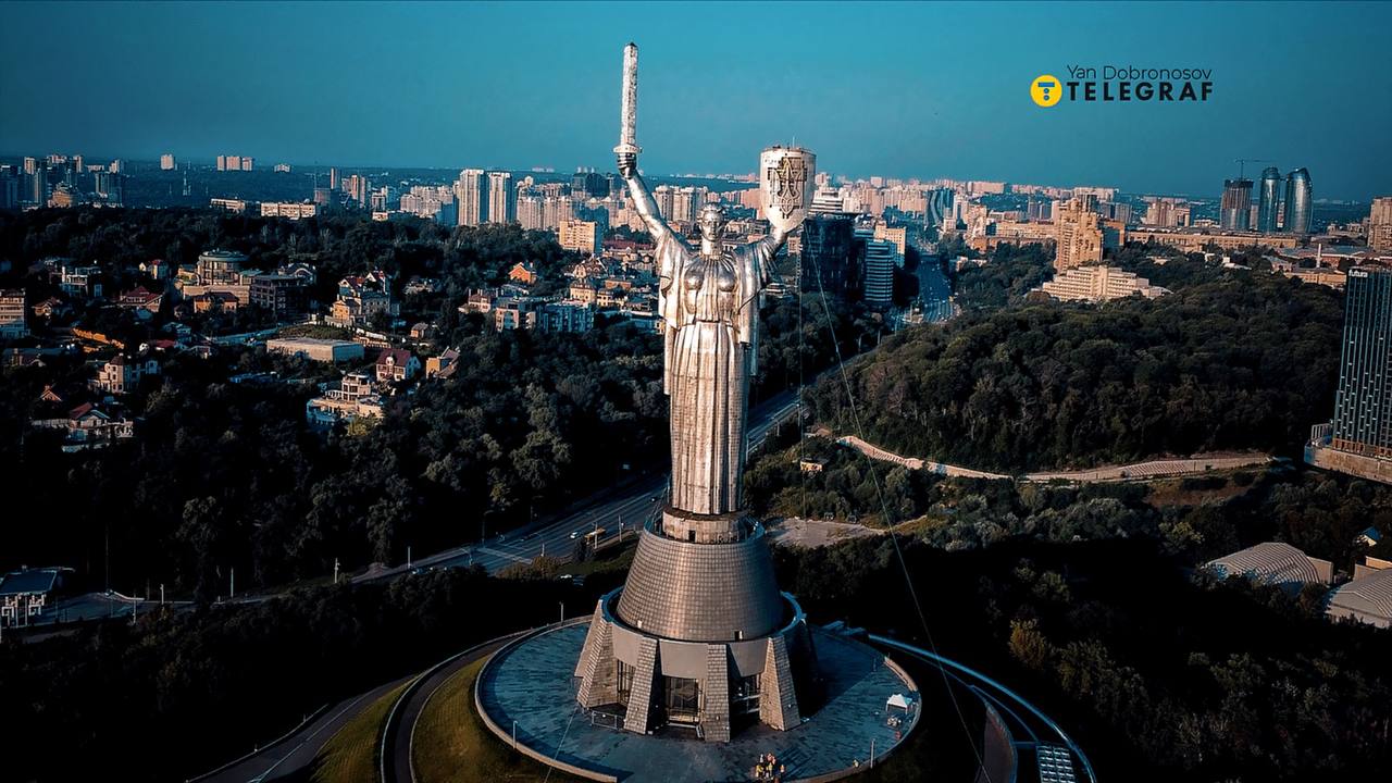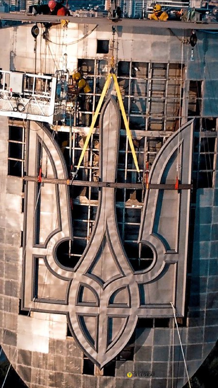 В Киеве на монументе «Родина-мать» продолжаются работы и в воскресенье утром, 6 августа, на нем установили трезубец, которым заменили советский герб с символами в виде серпа и молота, демонтированного ранее.