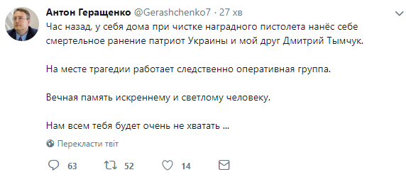 «Во время чистки наградного пистолета нанёс себе смертельное ранение патриот Украины и мой друг Дмитрий Тымчук. На месте трагедии работает следственно оперативная группа полиции», — написал Геращенко.