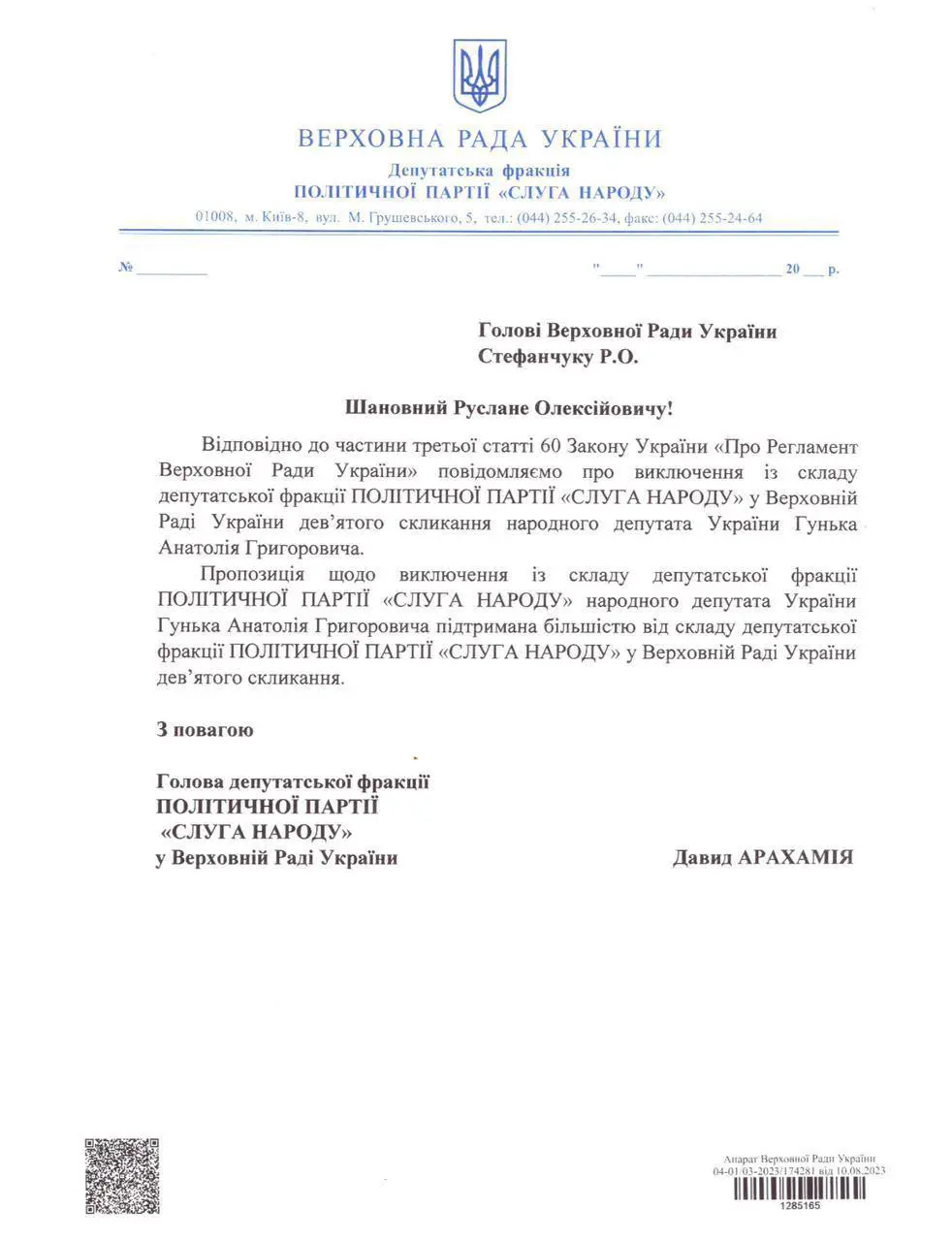 Нардепов Анатолия Гунько и Богдана Торохтия исключили из фракции «Слуга народа». Об этом сообщает глава фракции Давид Арахамия.
