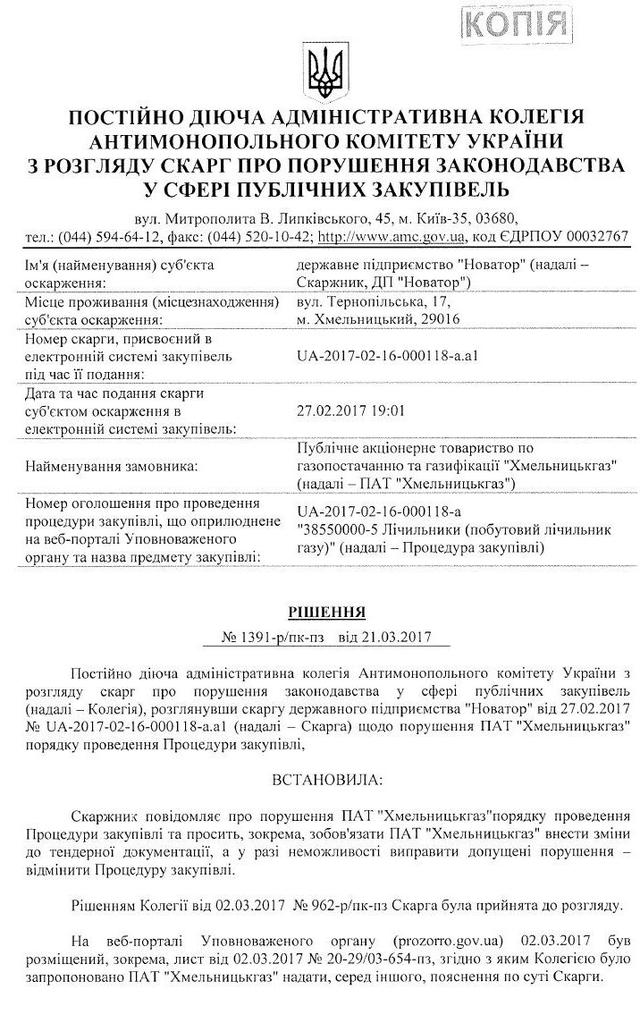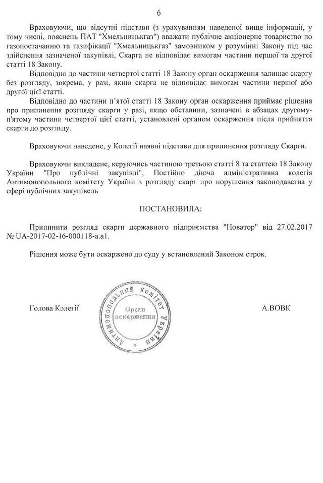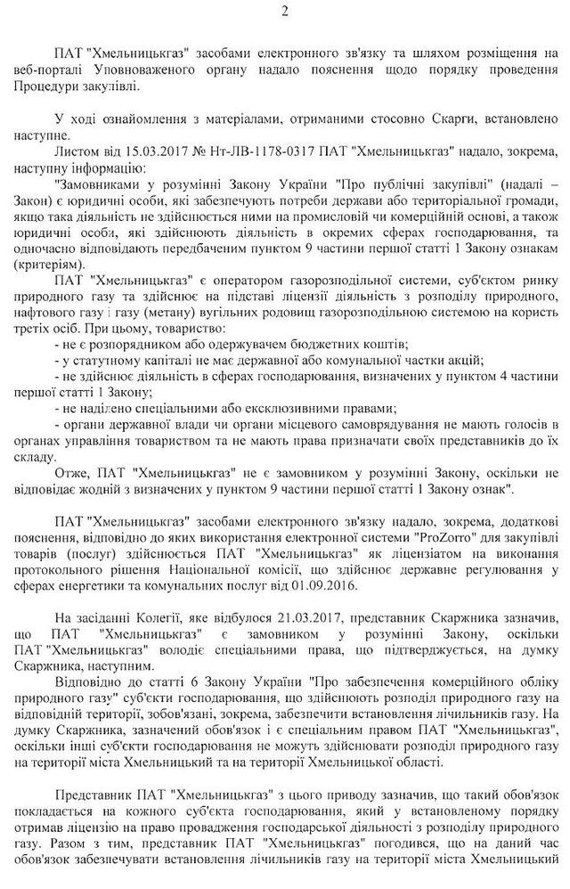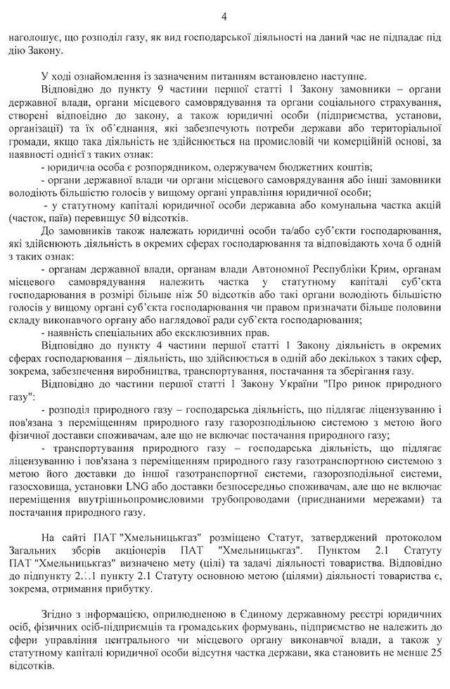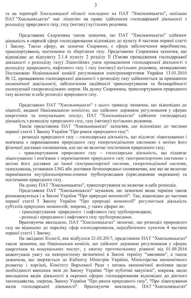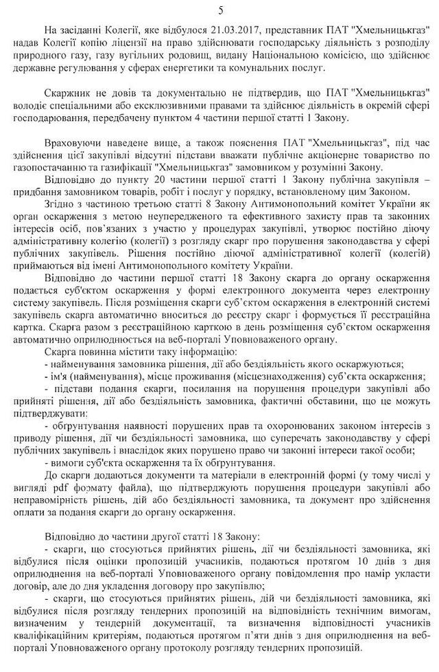 «Но АМКУ к разбору дискриминации производителей даже не подобрался. Потому первым пунктом объяснения шло следующее. Облгазы с порога АМКУ заявили, что они не являются Заказчиками в понимании Закона Украины «О публичных закупках»! По логике: «Ну, где мы, а где — монополия?». В коллегии АМКУ вышла дискуссия. Закончилась она тем, что лишь один из трех членов админколегии стал на сторону прозрачных трат облгазов, зато двое других, среди которых и председатель админколегии, решили, что облгазы таки — не заказчики, и поэтому жалоба на их тендеры не является предметом внимания АМКУ. Мол, облгазы не наделены специальными или эксклюзивными правами, а распределение газа по трубопроводам — это не его транспортировки, а значит облгазы не попадают под закон «О естественных монополиях». Вот этот финт в скриншоте решение АМКУ», — говорится в материале.