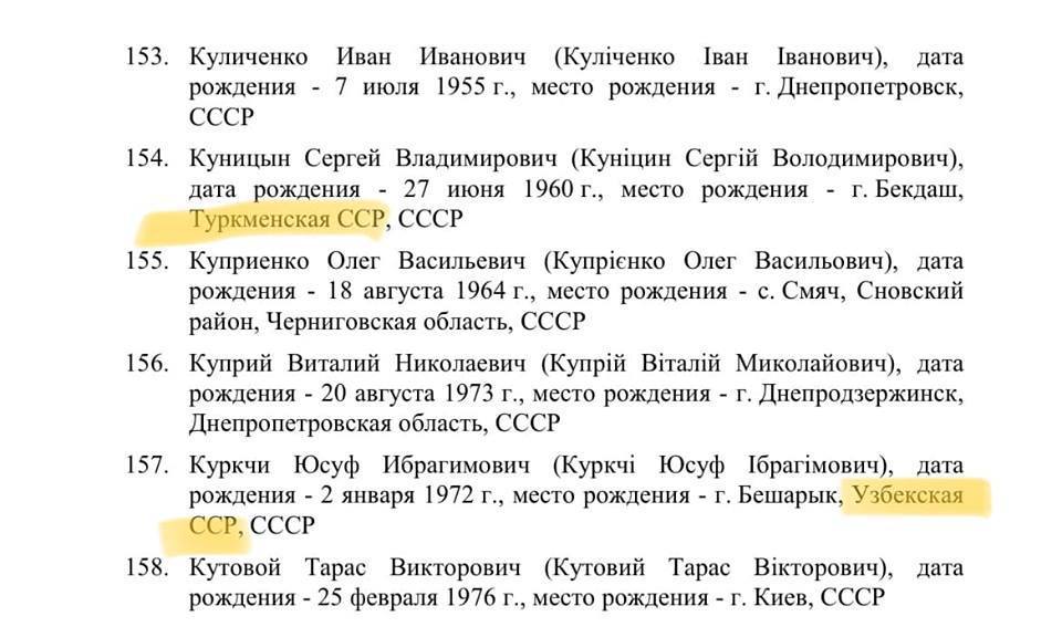 Во всех советских документах место рождения писали так: после населённого пункта и области – сначала советская республика (БССР, УССР, РСФСР и другие), потом собственно само государство – СССР. В санкционном списке это мелькает, но только если человек родился не в Украинской ССР, а, например, в Белорусской ССР. Тогда написано правильно: город такой-то, ССР такая-то, СССР.