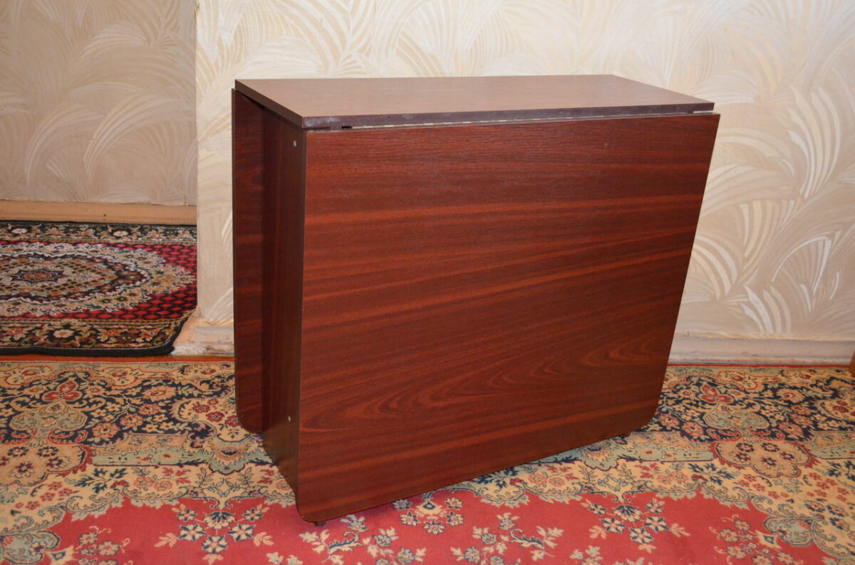 Для начала давайте посмотрим, как выглядел сам советский новогодний стол — не в смысле набора продуктов, а в смысле предмета мебели. В абсолютном большинстве случаев совковым новогодним столом являлся так называемый стол-книга, который выглядел вот так: