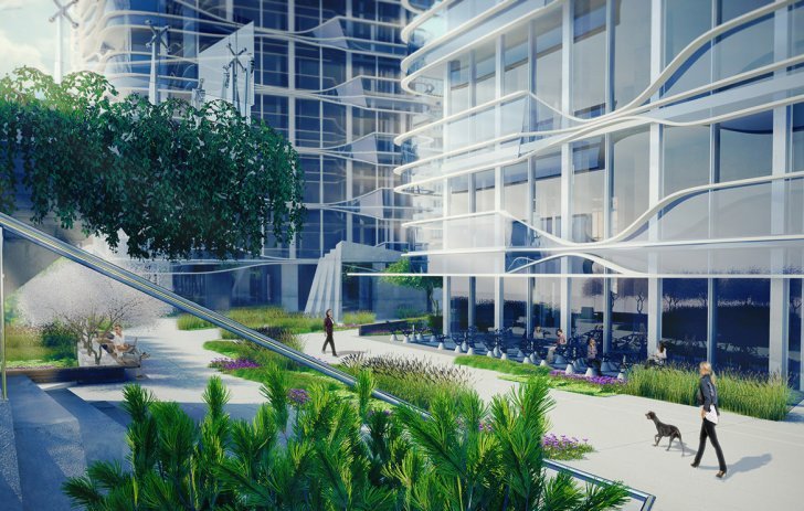 • Концептуальность и архитектурная значимость. Проект здания представляет собой три башни, совмещенные стилобатом. Внутри последнего размещается коммерческая зона и самый большой атриум в Украине.
