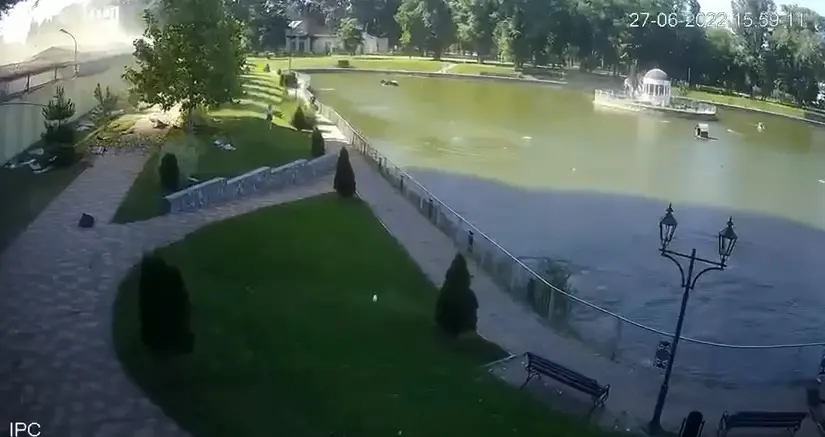 Киев Оперативный опубликовал видео первых минут ракетного удара по Кременчугу, снятое камерами видеонаблюдения.