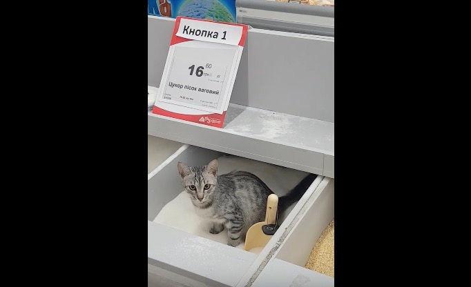 В Киеве в одном из супермаркетов очевидцы сняли на видео, как кошка залезла в открытый лоток с сахаром и сходила там по-маленькому. Видео было опубликовано в YouTube.