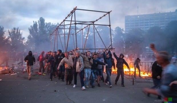 После того, как победили ситуацию в центре, а два трупа накрыли украинскими флагами, народ пошел громить очаг сепаратистов на Куликовом поле.