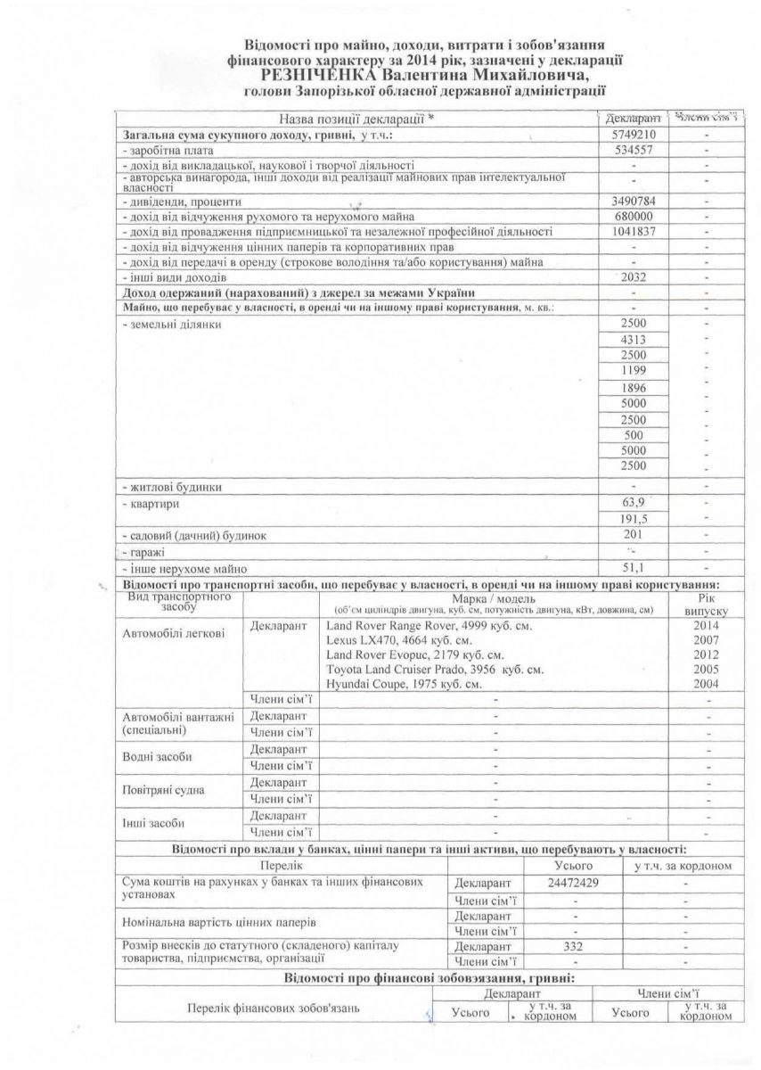 Что же касается финансового благосостояния Валентина Резниченко, то, мягко говоря, он не бедствует. Согласно декларации о доходах политика за 2014 г., размещенной на сайте Запорожской ОГА, губернатор за прошлый год заработал 5,7 млн грн. Более 60% этих средств составил доход от дивидендов и процентов. Кроме того, Резниченко является обладателем солидного автопарка, в который входят пять машин: Land Rover Range Rover, Lexus LX470, Land Rover Evoque, Toyota Land Cruiser Prado, Hyundai Coupe. Из недвижимого имущества стоит выделить две квартиры и загородный дом, общая площадь которых составляет 456,4 м кв.