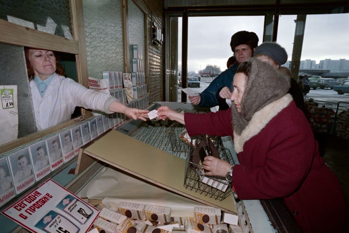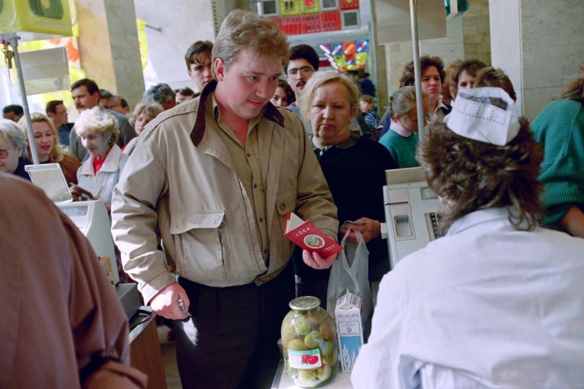 На снимке — гражданин показывает кассиру паспорт с московской пропиской, что было необходимо сделать для покупки некоторых дефицитных продуктов — продажа которых была ограничена. Кстати, обратите внимание на трёхлитровую банку отвратительных уксусных зелёных помидоров — в последние годы совка такая мерзость часто была единственным источником клетчатки.