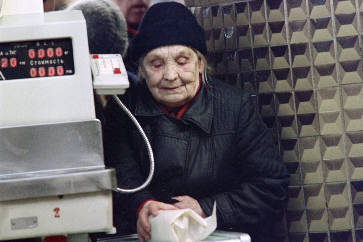 Очередь в мясной отдел. Посмотрите — стоят одни старики! Пока дети в поте лица добывали копейки для существования — бабушки и дедушки, вместо спокойного наслаждения достойной старостью, были вынуждены давиться и душиться в очередях за жалкими остатками свиной или коровьей туши после растаскивания всех лучших кусков мяса персоналом магазина и «блатными». Это ли не ужас?