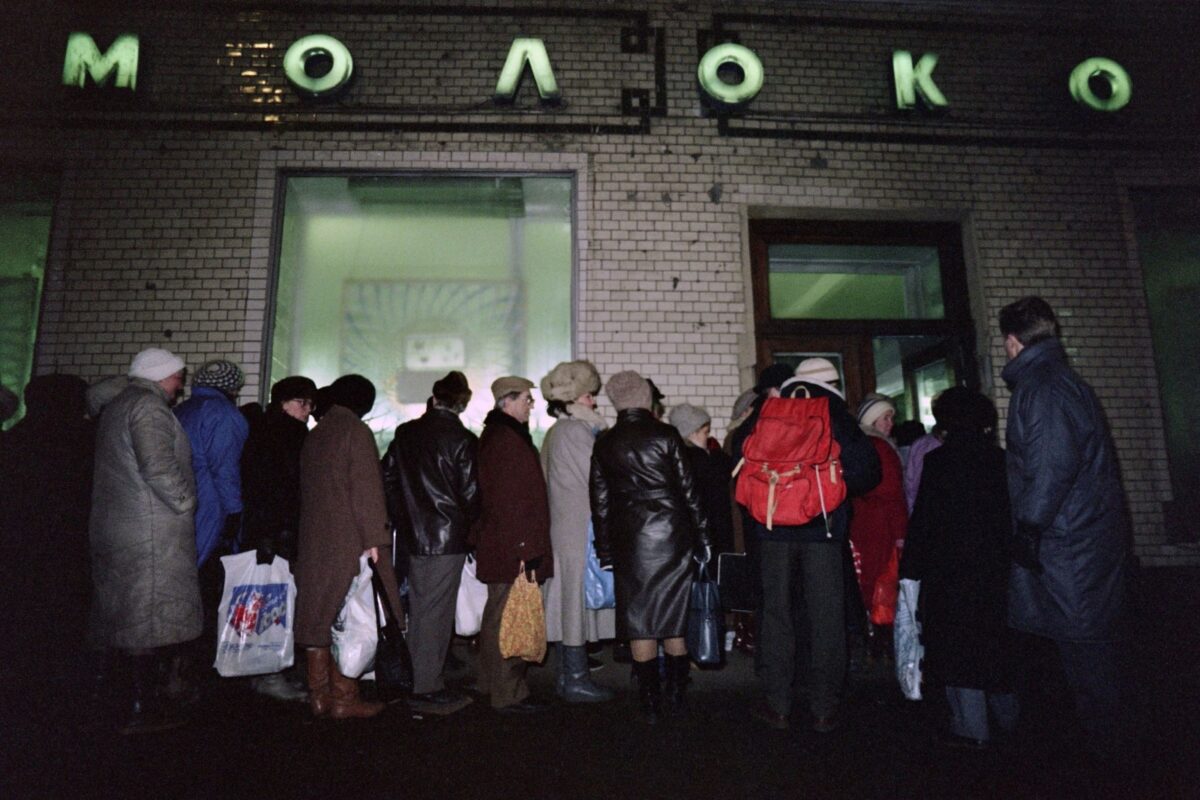 Очереди, очереди. Обратите внимание, что практически все подобрые кадры сделаны чаще всего вечером, а в очередях стоят в основном женщины разных возрастов. Это часть совковой жизненной модели — после тяжёлого трудового дня женщина была вынуждена отстаивать ещё 2-3 часа во всеразличных очередях, чтобы хоть что-то принести домой и начать готовить обед на завтра. Какая женщина может мечтать вернуться «обратно в совок»? Чтобы что?