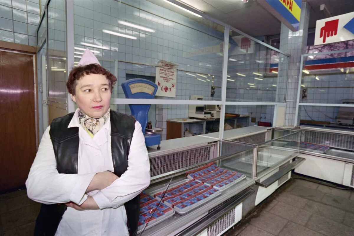 Продавщица возле пустых прилавков. В последнее время фанаты совка кстати стараются запутать своих оппонентов фразочками вроде «как это может быть, что в магазинах ничего не было, но везде стояли очереди? Нестыковочка!». Хочется ответить им — так очереди потому и были, что товары «выбрасывались» крайне редко, и люди были вынуждены стоять в очередях. Хочется им сказать — козлы, вы всё прекрасно понимаете, но специально хотите запутать народ.
