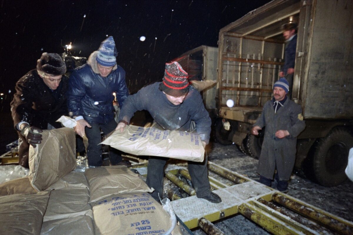А теперь часть вторая, которая относится к помощи «Загнивающего Запада» — который как известно, вечно мечтал о том, чтобы уничтожить СССР — да так мечтал, что за последний век четыре раза спасал Россию от голода. Вот это на фото — как раз четвертый раз. На фото — добровольцы разгружают в московском аэропорту гуманитарную помощь из Израиля — против которого вонючий СССР все свои годы вёл вялотекующую войну, обзывал «израильскими сионистами» и спонсировал окружающих дикарей — вооружая их и подстрекая их на войну против Израиля.